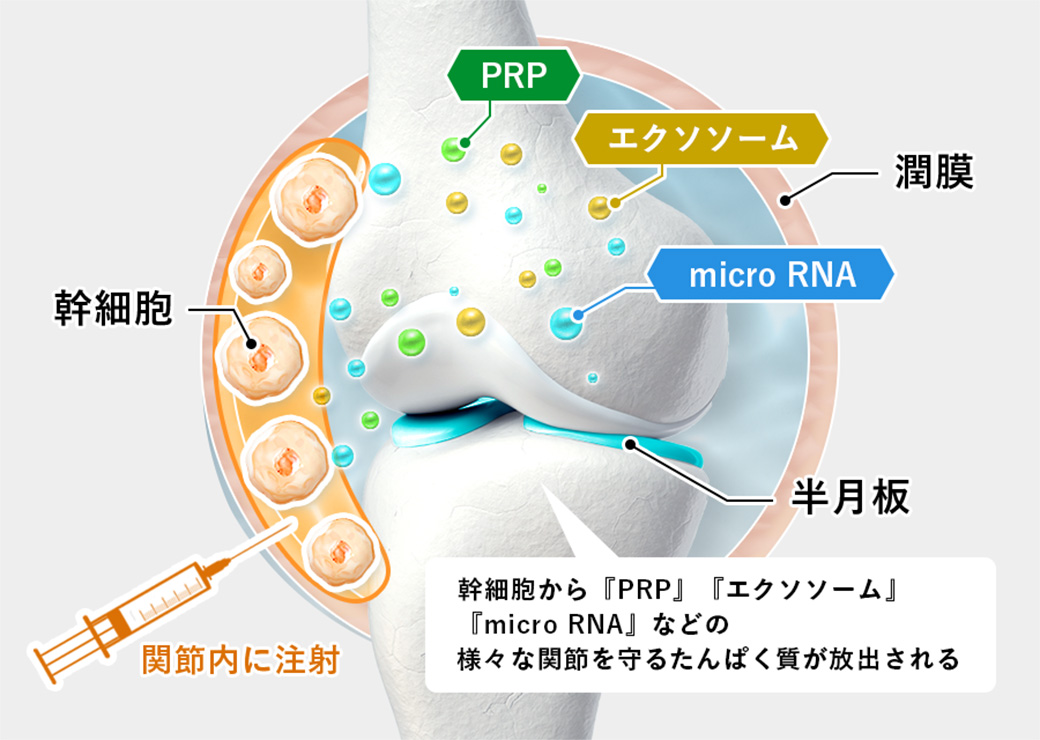 脂肪幹細胞を関節内に注射すると、関節包の内側にある滑膜という膜に接着します。そこで、3-6 カ月間くらいかけて育ち、滑膜細胞に近い細胞(滑膜幹細胞様細胞)に分化します。そして、関節の中に、PRP、エクソソーム、microRNAなどの関節を守るタンパク質の分泌を始めます。関節の中にPRP を作る工場を作るイメージです。それによって、年単位のより長期的な効果の継続を期待できます。