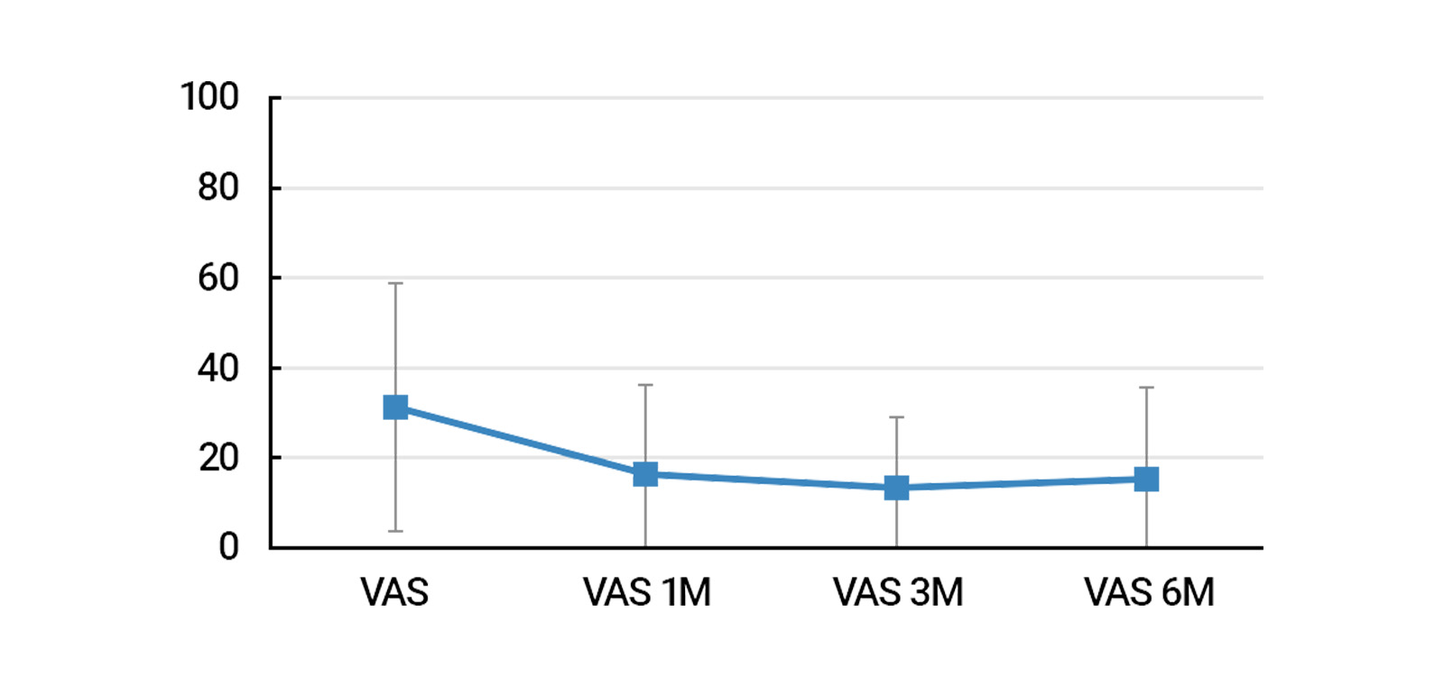 PRP 投与後、1 カ月で VAS が有意に低下し、痛みが抑えられている事が分かります。投与後 6 カ月経過しても、効果は持続しています。