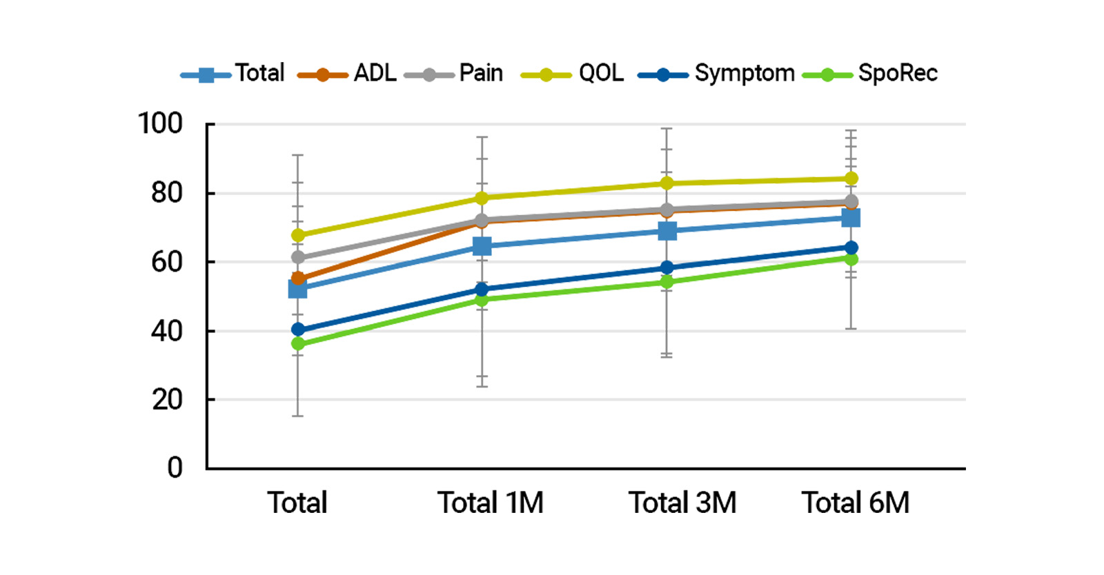 KOOS:Knee injury and Osteoarthritis Outcome Score の略です。患者さん自身が自分の膝機能を評価する尺度です。高ければ高いほど、膝機能が高くなります。